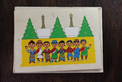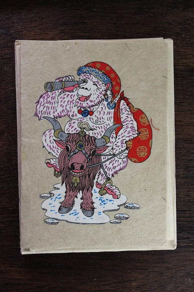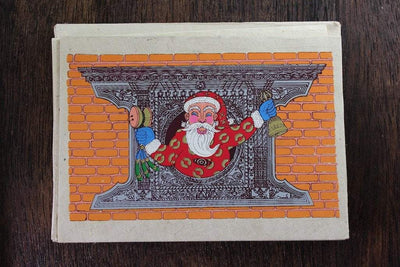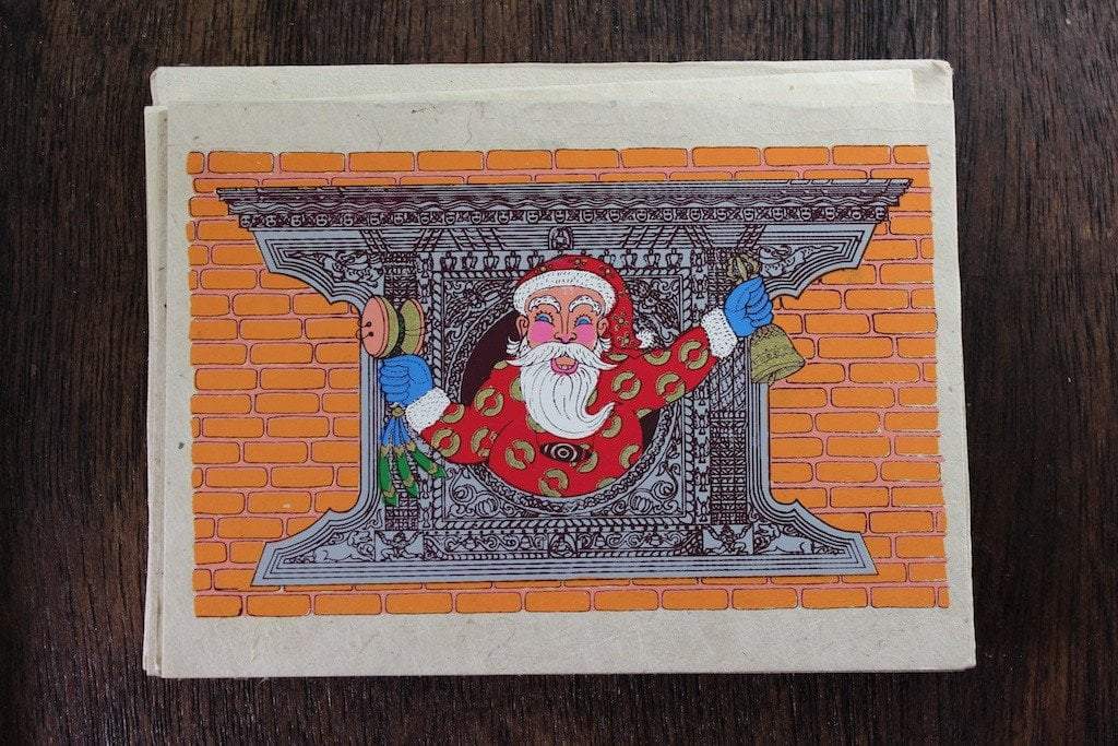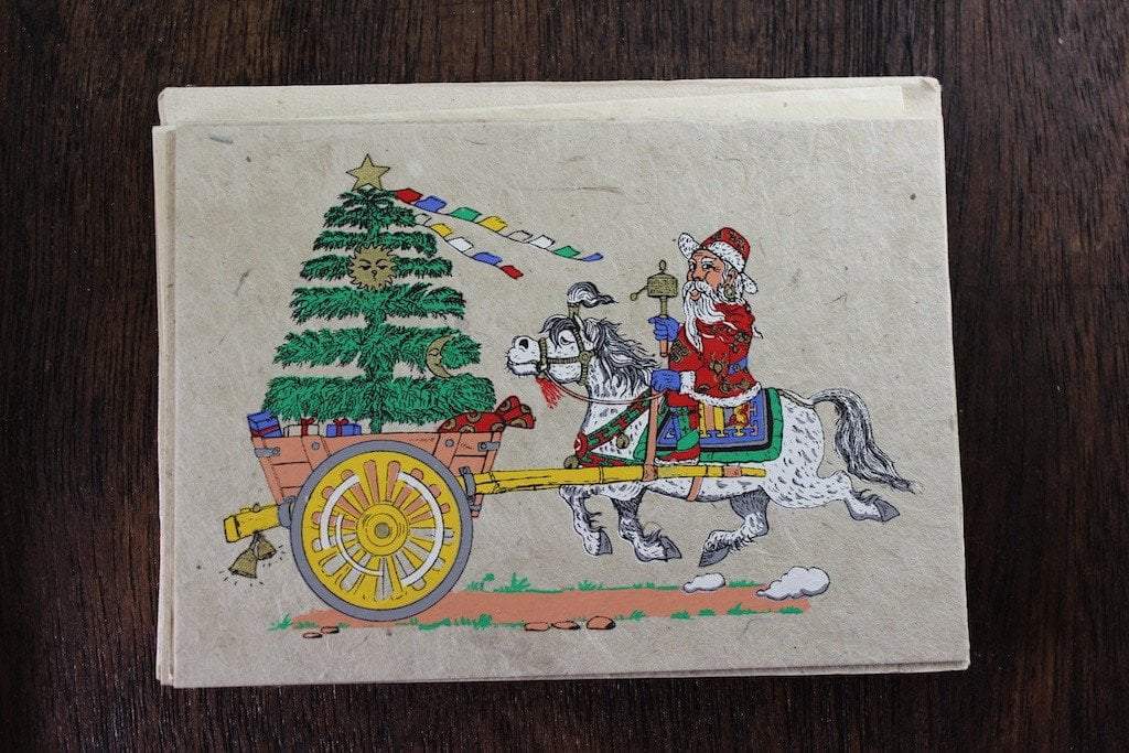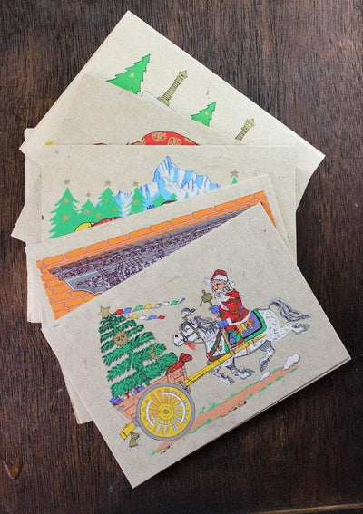 Set of 5 Christmas cards. Hand printed on hand made paper. Made with eco-friendly completely sustainable Lokta paper made from the bark of the daphne bush.