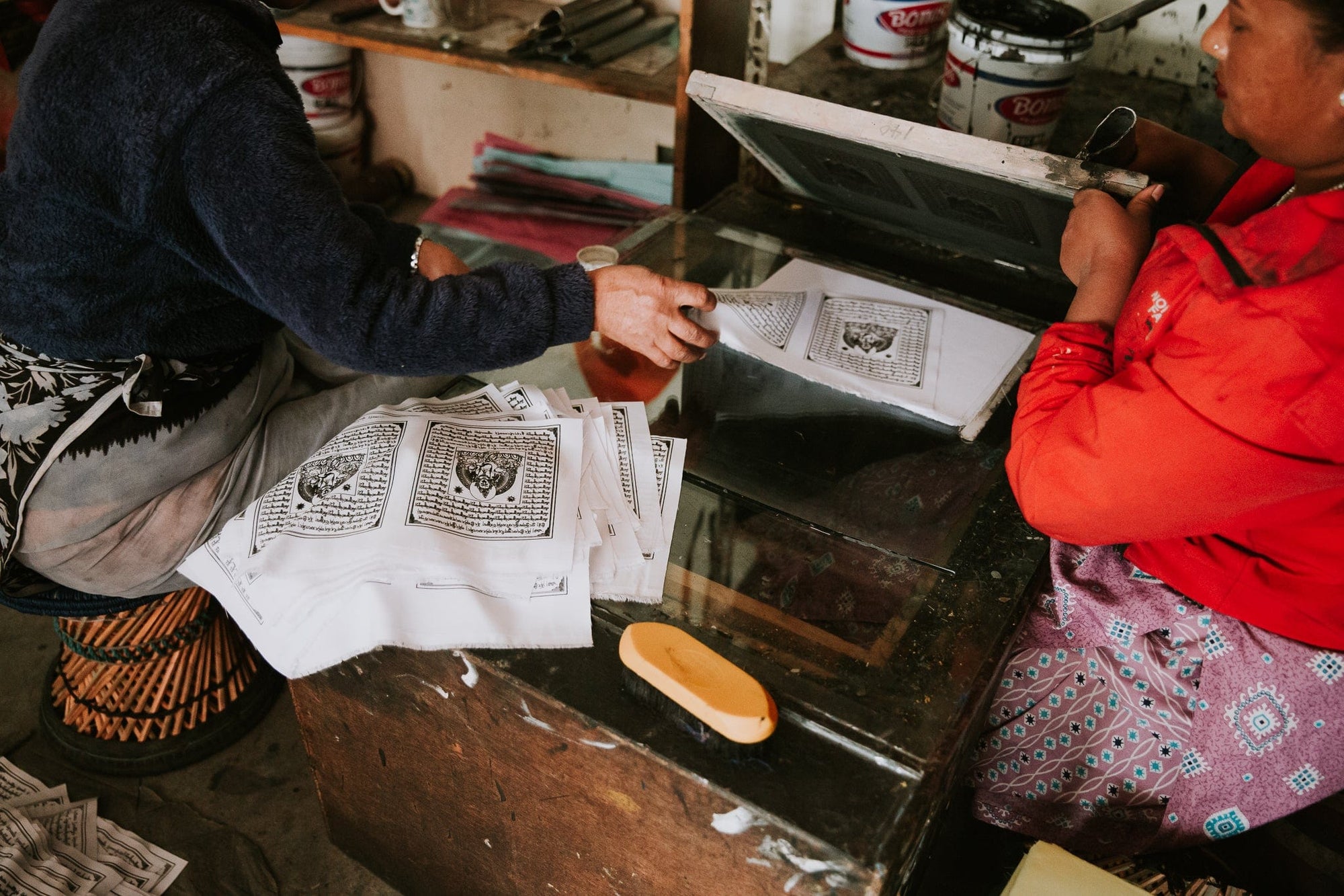 Set includes 10 flags that measure approximately 8 by 9 inches.  Entire strand measures about 8 feet long.  Handmade of hemmed cotton in Nepal.