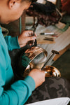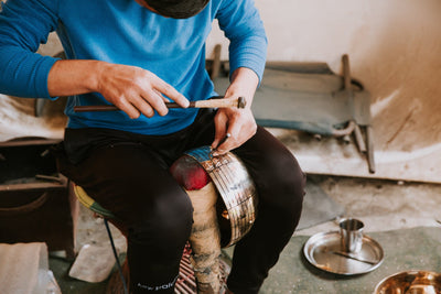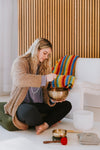 Your bowl comes with a wood and suede striker and our Stone & Thread cushion hand stitched and stuffed with up-cycled materials. Also includes a DharmaShop keepsake bag.