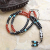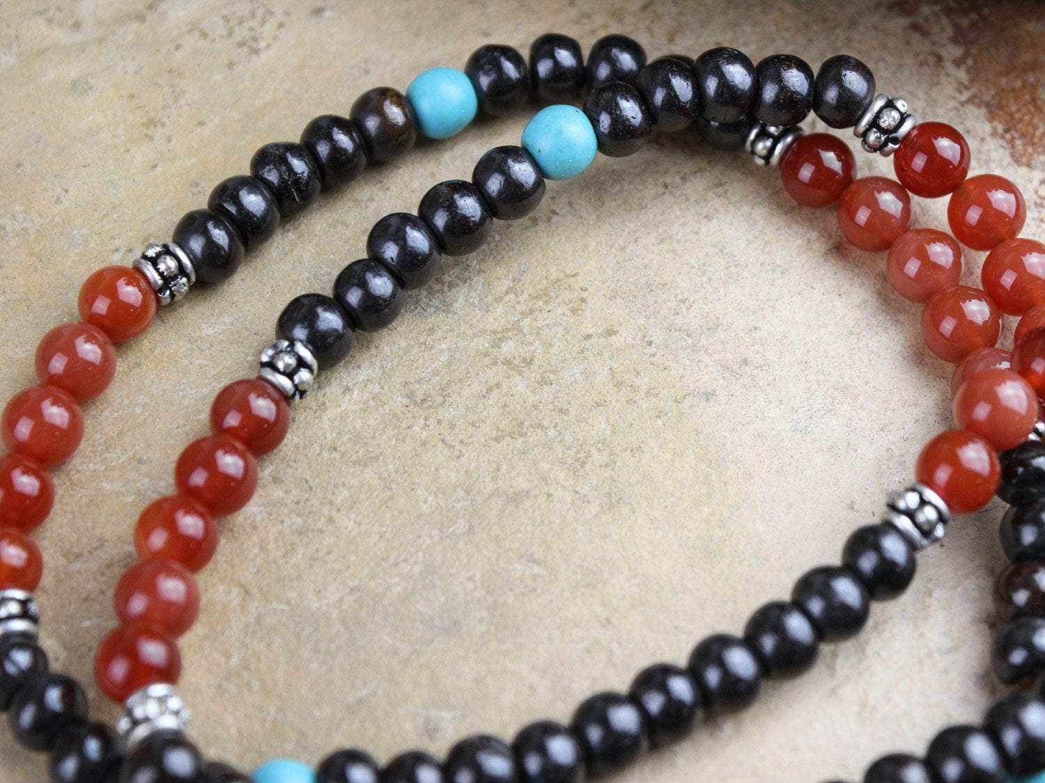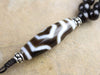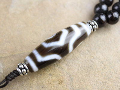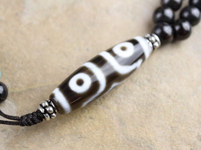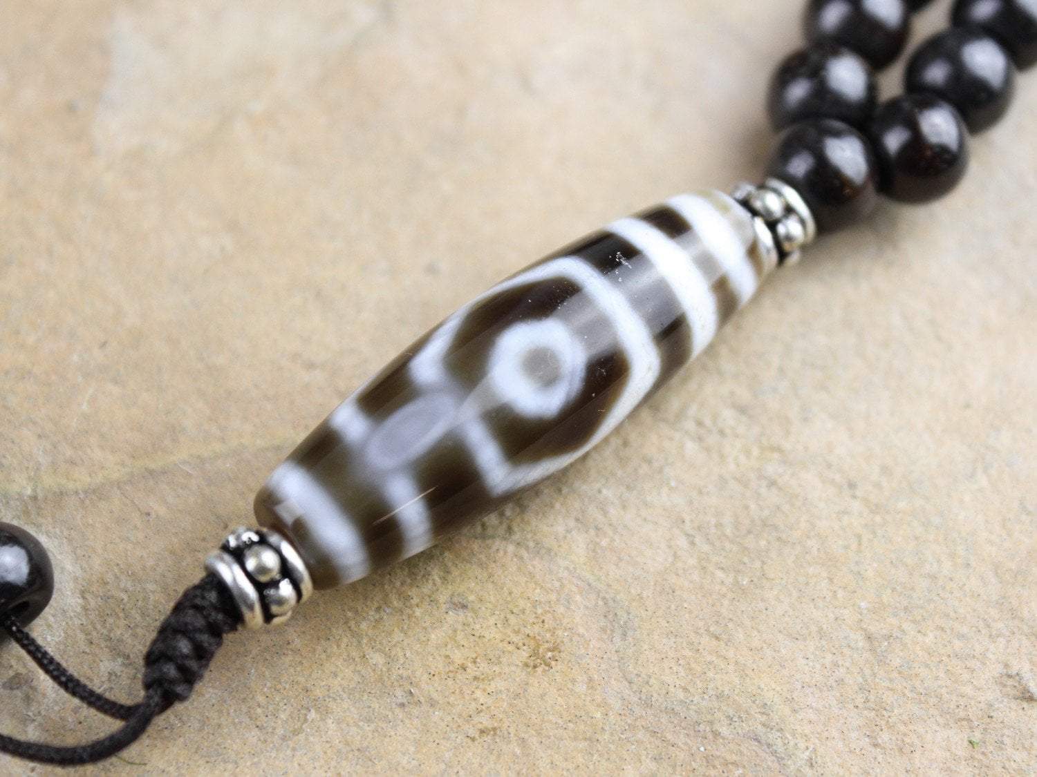 Another amazing Dzi bead necklace design from Kathmandu, Nepal! This necklace features a true agate Tibetan 3-eye Dzi focal bead and an adjustable closure. It is accented with black water buffalo bone beads, carnelian, and turquoise beads. The adjustable knot comes in handy if you want to wear around your wrist. The 3-eyed Dzi represents the three stars of luck: happiness, honor and longevity. It is the bead of wealth, health, and said to bring continuous fortunes.