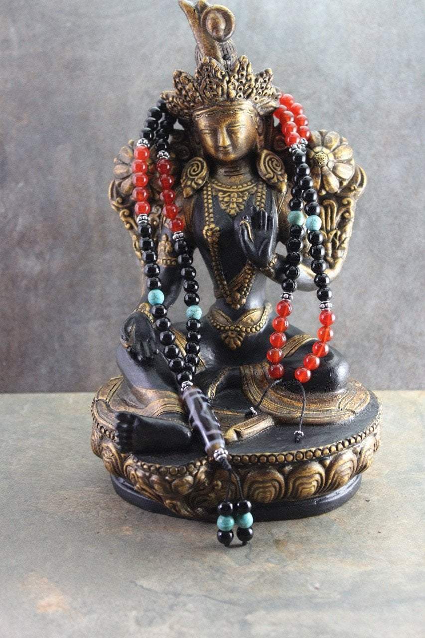 A note about bone beads: Tibetan nomadic life is hard, and in the cold there is little to eat. Water buffalo is a main staple in Nepal and Tibet, and when an animal is used for food or passes naturally, nothing is wasted. These amazing bone beads are handcrafted by artisans who recycle and reuse everything in daily life and spiritual practice.