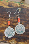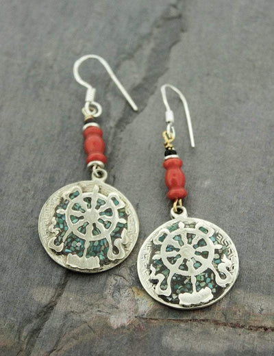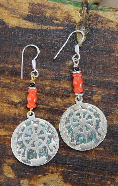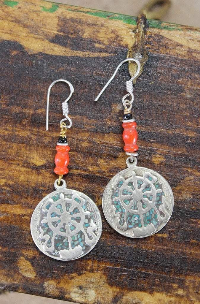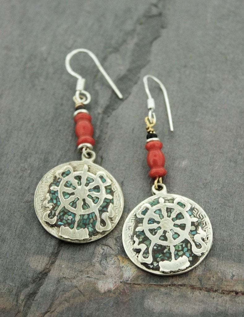 Make a statement with these awesome, bold Tibetan earrings. Hand crafted turquoise inlaid earrings plated in silver with sterling silver french hooks. Made in Nepal.