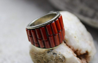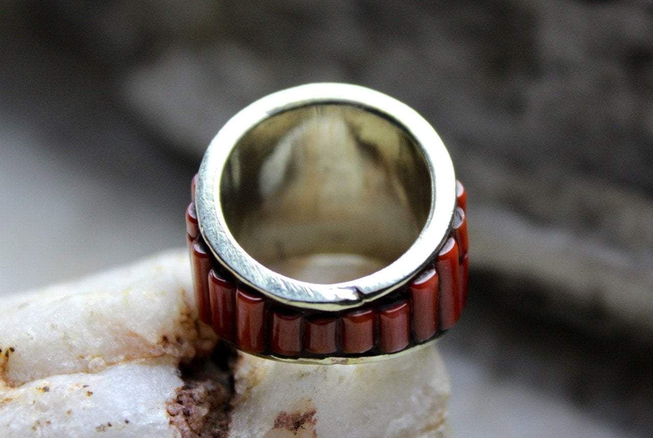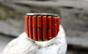 Coral and brass compliment each other beautifully in this modern, stylish ring. Size and design suitable for a man or woman. Made in Nepal. QUANTITIES VERY LIMITED.