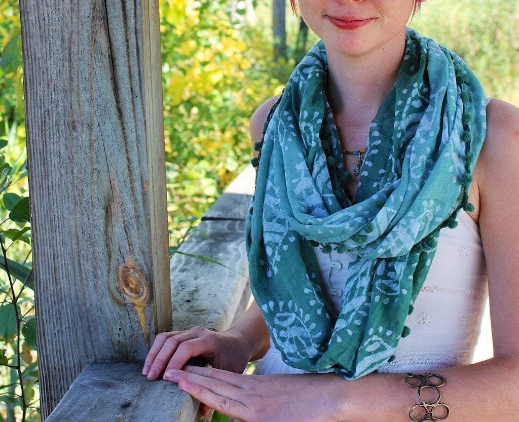 This lightweight, naturally dip-dyed circular scarf is made using a traditional batik technique and trimmed with soft, tiny poms along the edges for a more unique look.