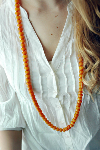 Handmade in Nepal of natural tree resins. Contains 10mm beads. Measures approximately 40 inches long.