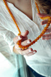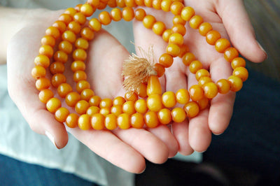 Amber has become so expensive that the average person in Nepal and Tibet use natural tree resins to create faux amber that is much more affordable. We just received these cool faux amber bead malas and they are lightweight, well made, and well, much cheaper then the real thing.