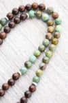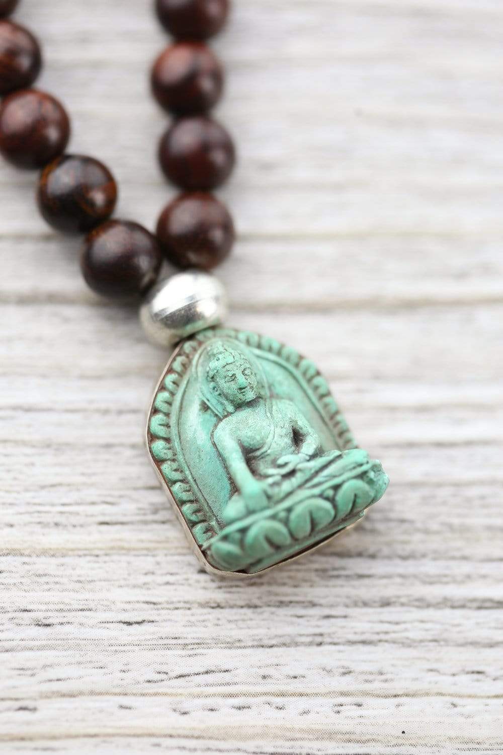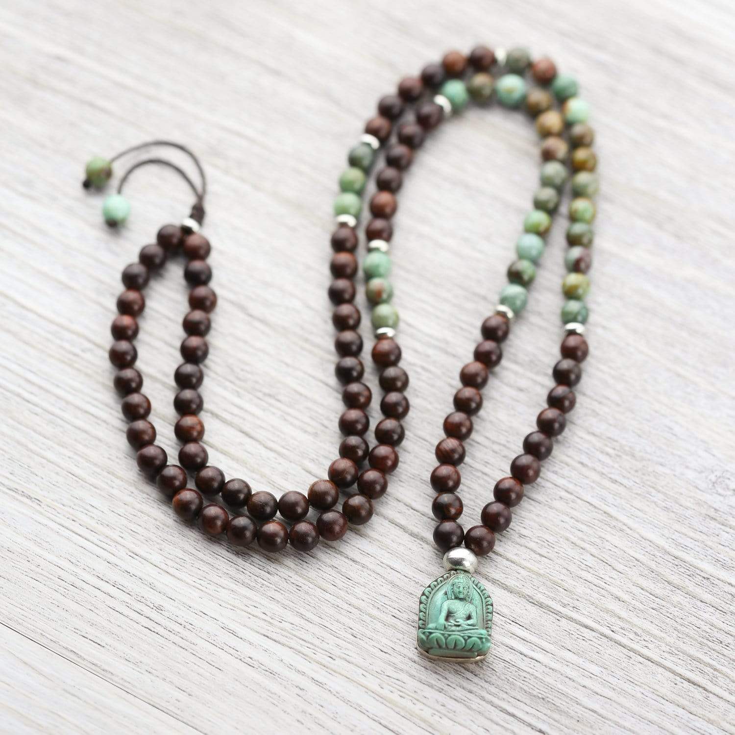 Mala measures approximately 34 inches around with an adjustable knot. Beads are 8mm. Pendant is about 1 inch.