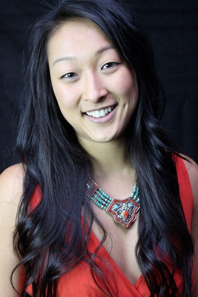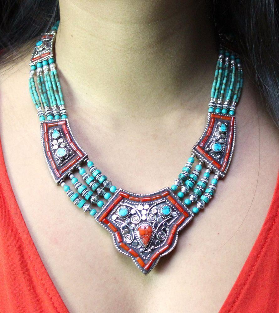 Another amazing necklace from Karma. Turquoise strands link traditional Tibetan beads inlaid with coral, silver plated brass and turquoise.