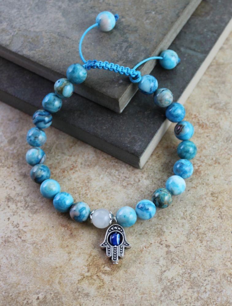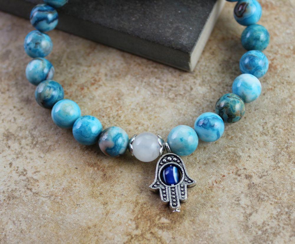 Our new wrist mala is handmade in Michigan at Dharmashop.com. 20 Crazy Lace Agate beads with one snow quartz and a Hamsa pendant from Israel.