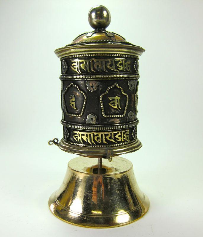 All around stupas and Buddhist centers in Nepal you see prayer wheels like this one. We scaled it down a bit to fit on your desk. Spin clockwise whenever you feel the need to improve your karma :) Prayer Wheels are used daily by monks and laypersons alike in all Tibetan Buddhist communities. The outside of the wheel has the mantra 'Om Mani Padme Hung' (Hail to the Jewel in the Lotus) This is the mantra of Chenrezig, the Buddha of compassion. Inside the prayer wheel are scrolls containing this mantra. Every time the wheel is turned it releases all of these mantras into the heavens.
