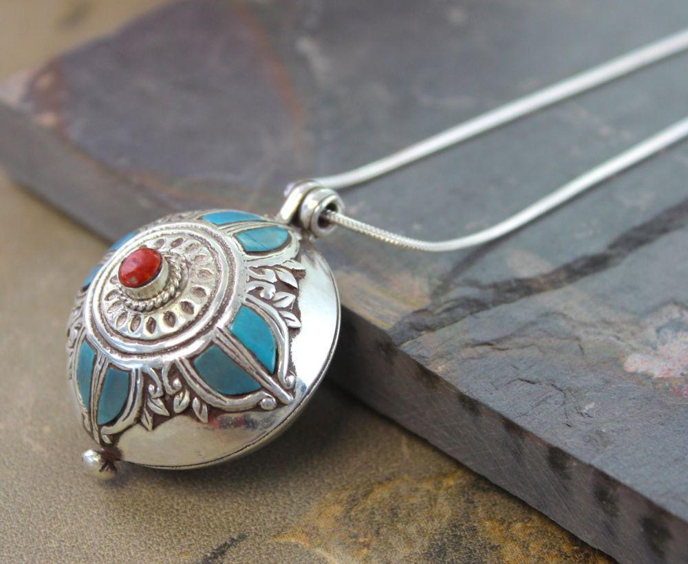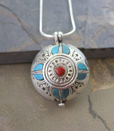 Large sterling silver gau has semiprecious inlaid design on front, mantra on back,. Opens like a clamshell with a hinged back and threaded catch. Hand made in Nepal, 1 3/4"