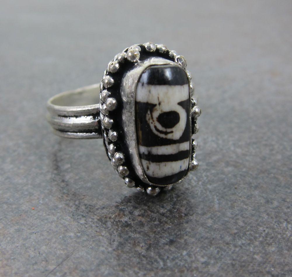 Nice bone dzi beads made in Nepal mounted on a silver plated ring.