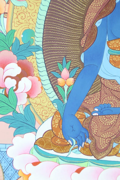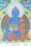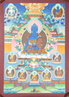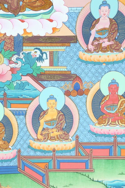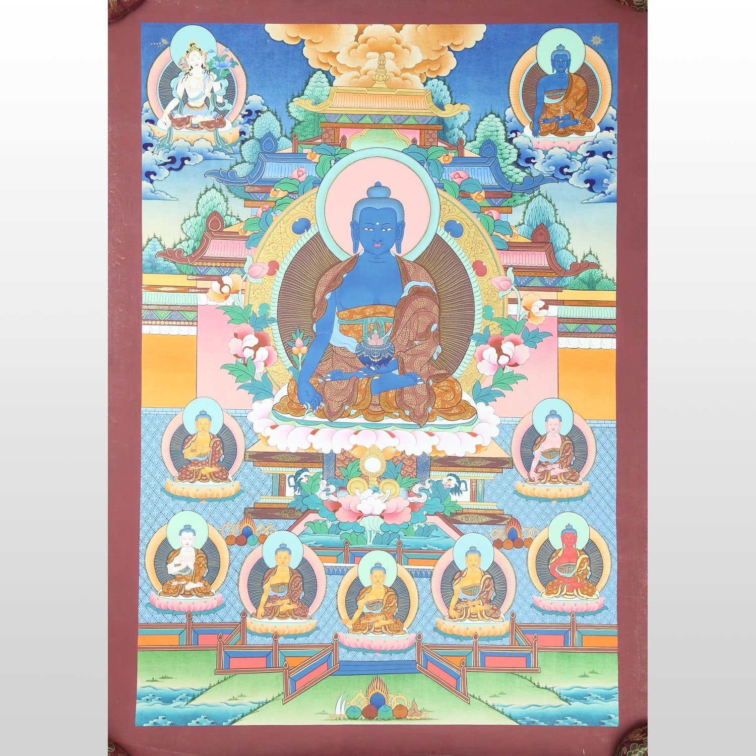 The thangka depicts a beautiful detailed Eight Medicine Buddha design and comes unframed and ready for Western style framing. It is done entirely by hand on cotton canvas using natural mineral and vegetable pigments with 24K gold details. The complicated designs, intricate brushstrokes, and extraordinary detail make these thangkas genuine works of art.