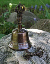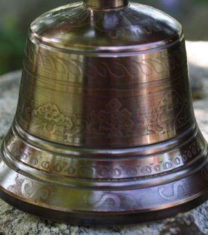 The body of this copper bell is lightly etched with the Tibetan 8 auspicious symbols. Sound is beautiful. Handle of bell and dorje are cast bronze. Made in Nepal. Size:Bell is 4 and 1/2 In. Tall