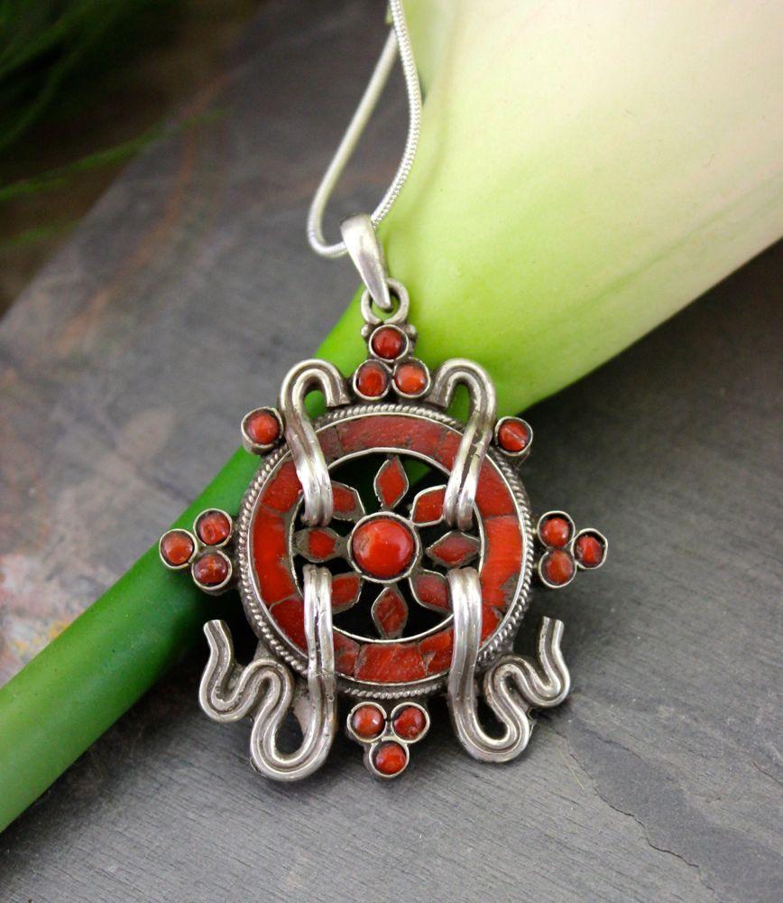 These solid silver and coral pendants are simply breathtaking. An exquisite Tibetan Dharma Wheel in solid coral and sterling silver.