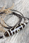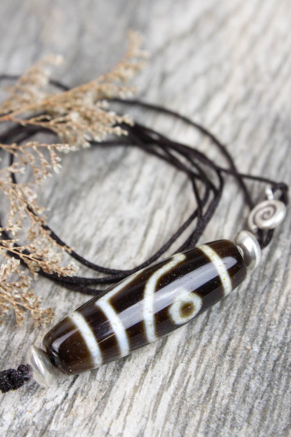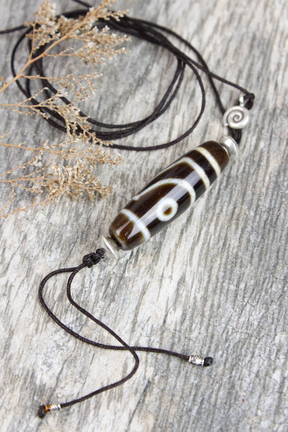 True agate 2 eye Dzi bead strung on black cord accompanied by both small accent beads and includes a petite silver spiral charm. Not adjustable. 1 1/2 inch long bead. Cord is approximately 34 inches around and hangs about 21 inches long.