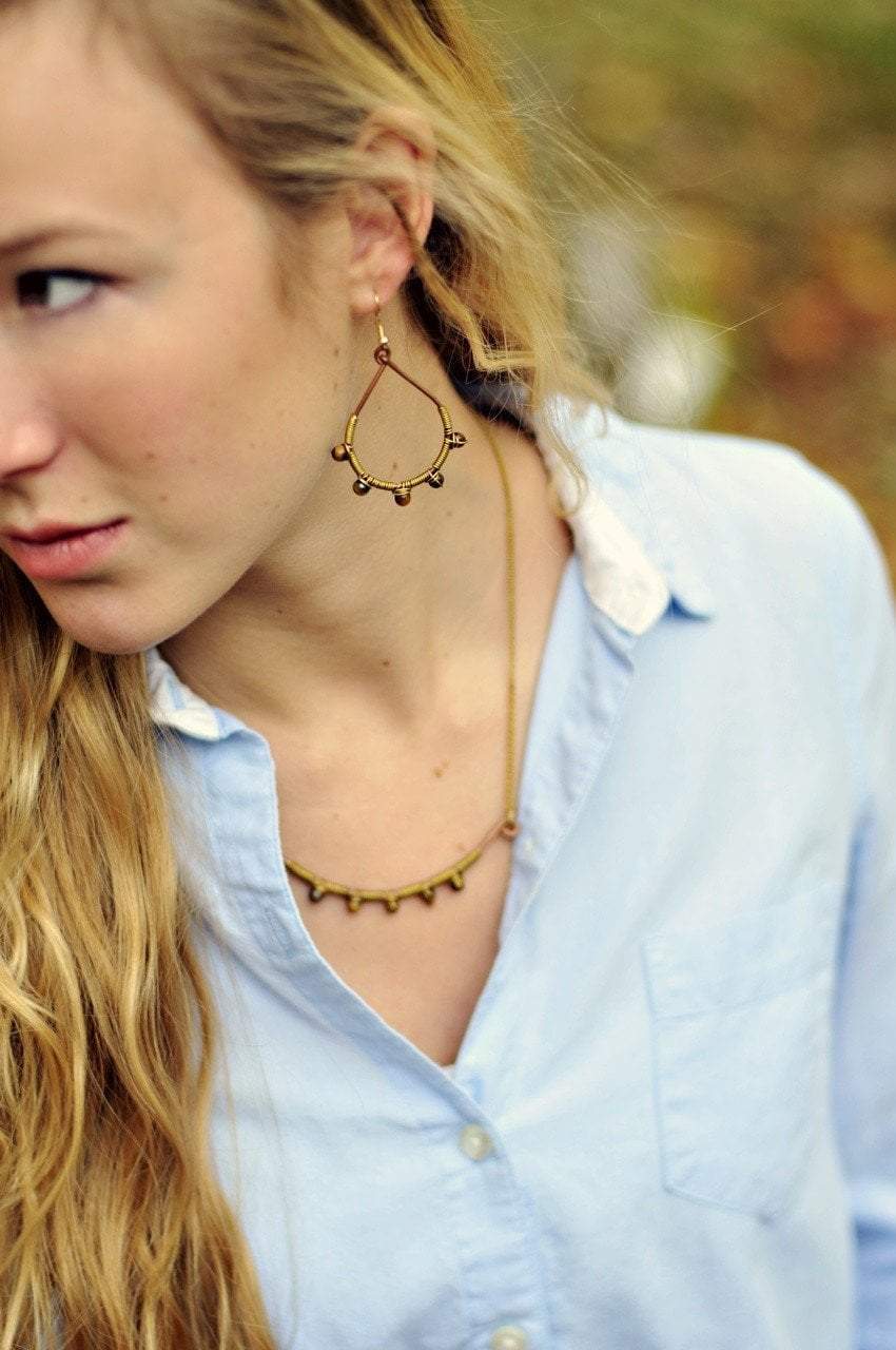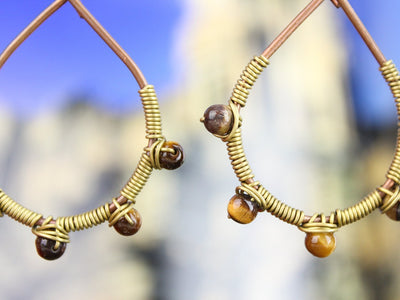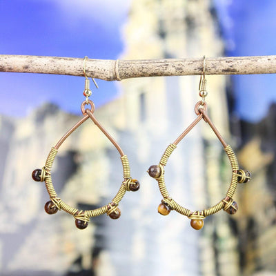 Make a statement with this ethnic Fair Trade jewelry collection! These earrings are entirely handcrafted from gold wire, recycled materials, and tiger eye beads. They feature a great tear drop shape made of gold wire.