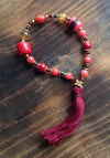 Christy has outdone herself with this handmade Tibetan mala bracelet. Faceted garnets, citrine, coral and gold plated spacers on tough elastic cord with a hand made cotton tassel.