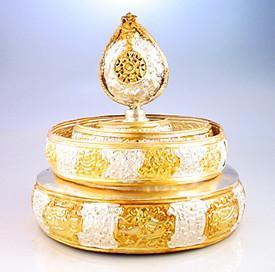 The Mandala is a representation of the universe. Each layer is filled with offerings until the multi layered mandala is filled with coins, beads, jewels or rice. The 'universe' is then offered over the head to show you would give the entirety of existence to help others attain enlightenment.