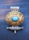 This solid silver gau is gold plated and has a turquoise stone set in sterling silver. Opens to hold an image or prayer scarf.Size:1 inch