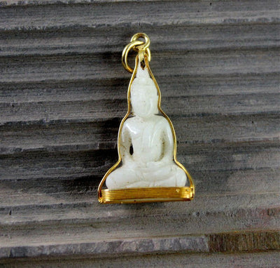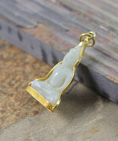 Hand carved 1 inch pale green jade Buddha wrapped in a gold plated frame. Handmade in Thailand
