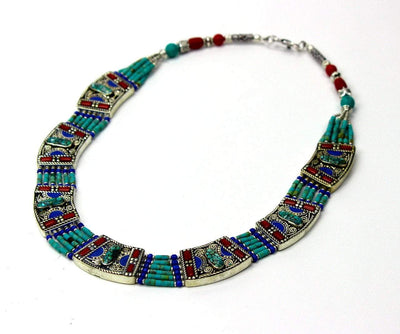 The sky over Tibet is a pale but vibrant blue, and the waters of the lakes a deep lapis. No wonder the Tibetan people love the color palette of turquoise, coral, and deep blue lapis. This beautiful Tibetan necklace is handmade in Kathmandu, Nepal by Tibetan master artist Karma Dolma.