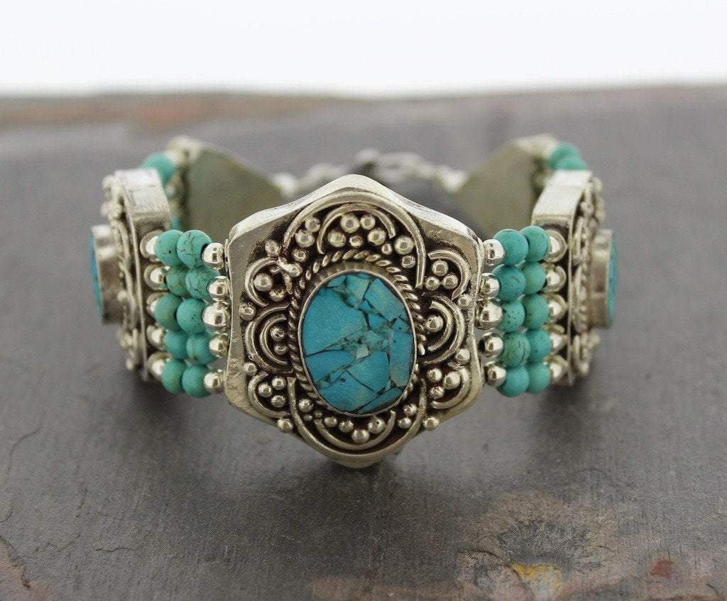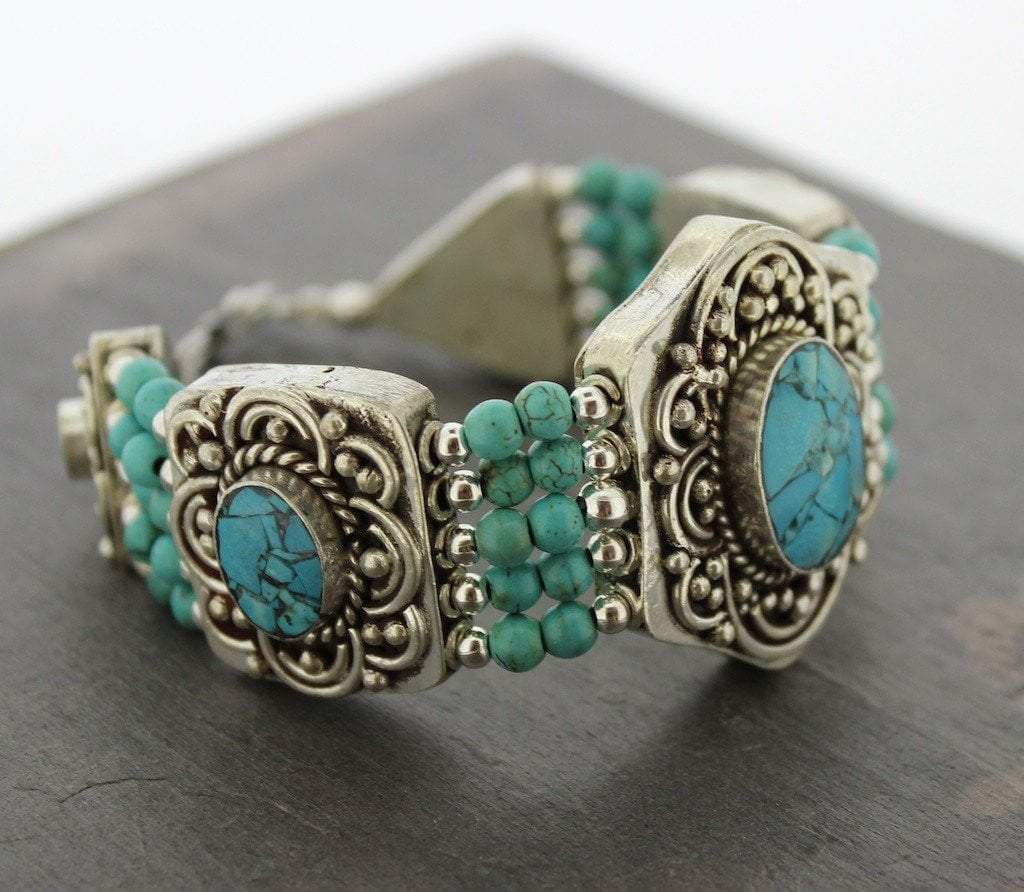 These are beautiful! Just in from Kathmandu. These traditional bracelets were handmademade with silverplated brass and inlaid turquoise. Strung together in the shadow of the boudhanath stupa in Kathmandu.