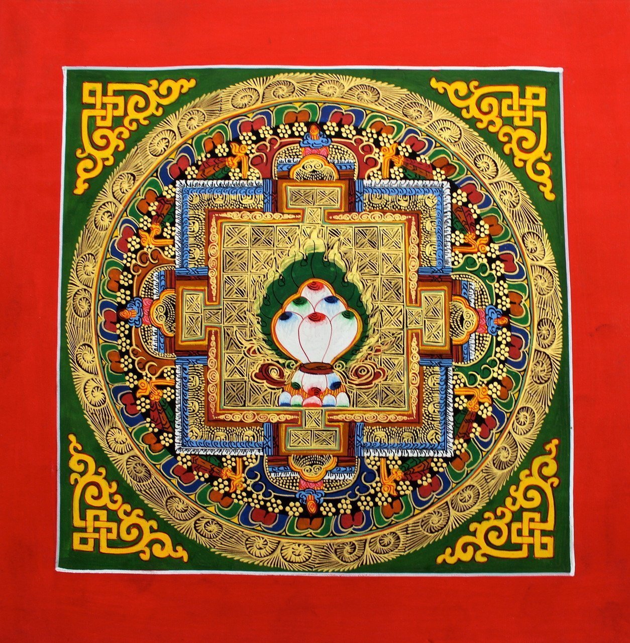 This unframed thangka is ready for western style framing. We have a number of mandala thangkas framed in western frames in our home and they look truly amazing matted with two colors and a dark wood or gold frame.