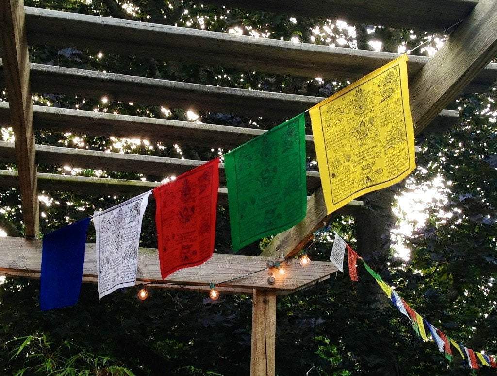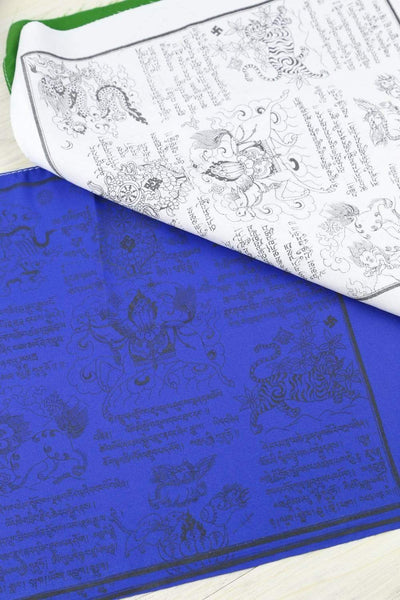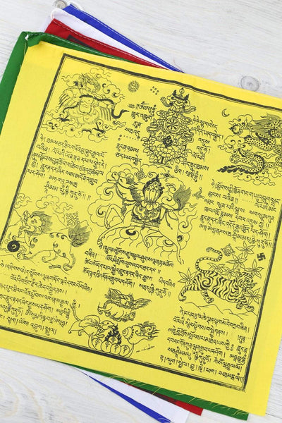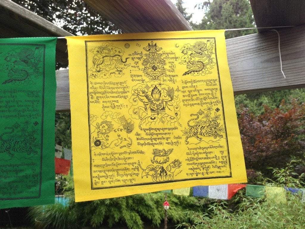 Tibetan dragons are known as protectors of Buddhism whose thunderous voices awaken us from delusion and increase what we know through hearing. Displaying a dragon banner is said to protect one from slander and enhances one’s reputation.