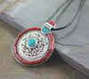 Tibetan jewelry can be bold and large, this 2 inch pendant makes a great statement. Turquoise and sherpa coral (old red glass trade beads) are set in silver plated brass.