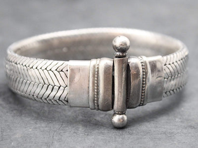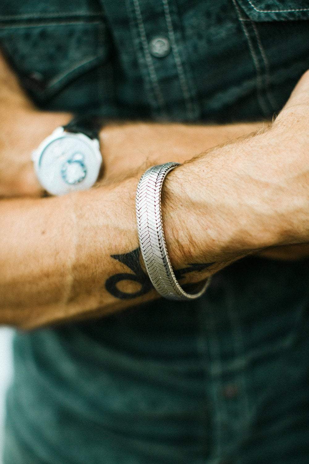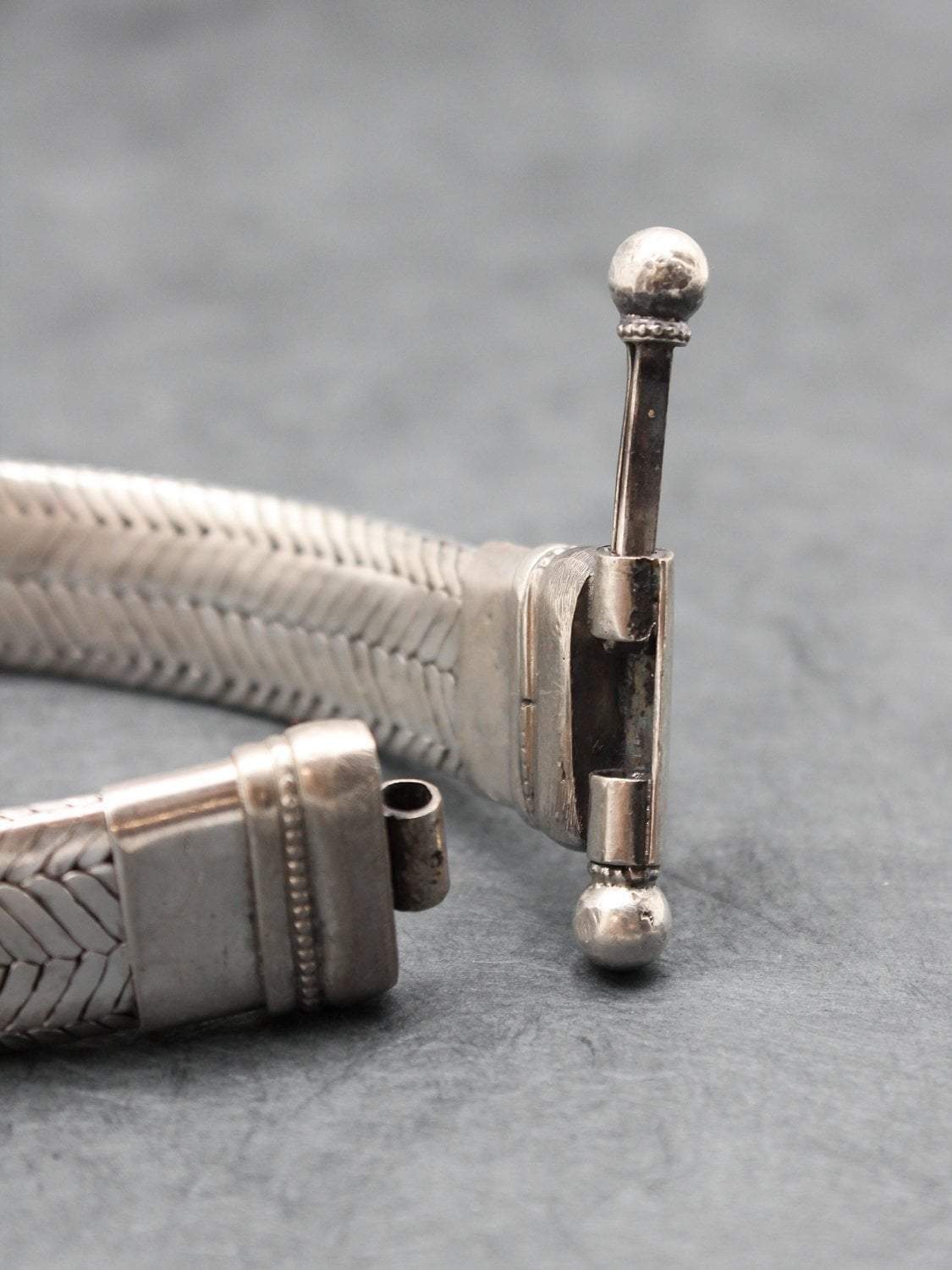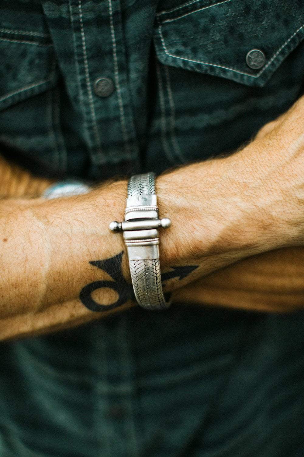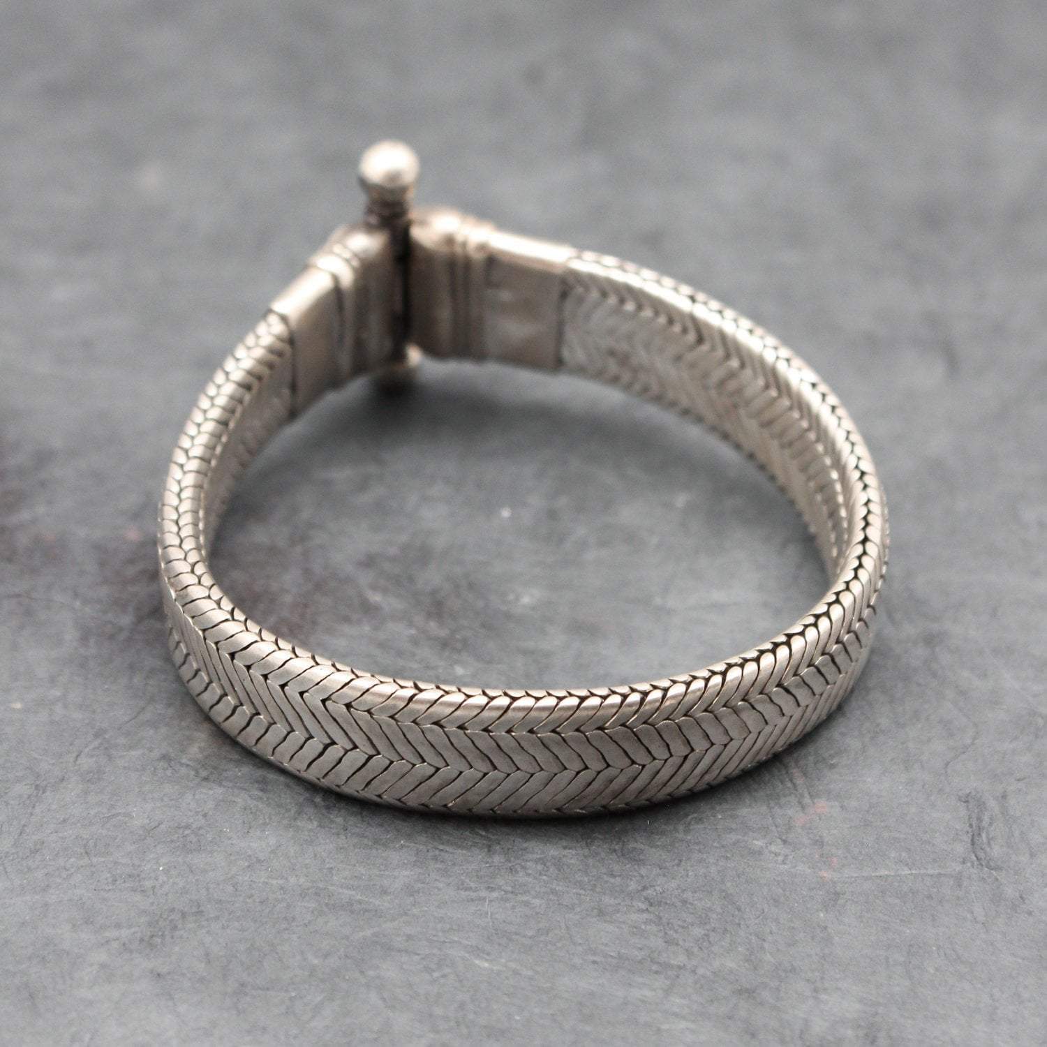Our exclusive, one-of-a-kind, solid silver men's bracelet is made with (.98) Hill Tribe silver and features a stylish and intricately woven design with a unique closure. Hill Tribe silver has a higher then .925 silver content and displays a radiant shine that rarely needs to be polished.