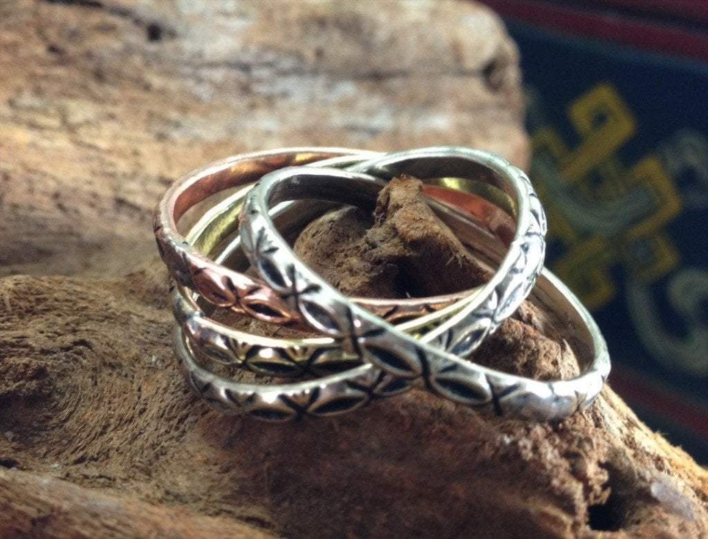 Made from recylced metal in India, these rings are 4 separate rings interwoven (copper, brass, 2 silverplated). Fair-Trade certified.