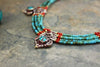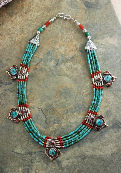 Named after the deep turquoise water of Lake Namtso in Tibet, this necklace is made with Tibetan inlaid spacers and coral and turquoise beads.