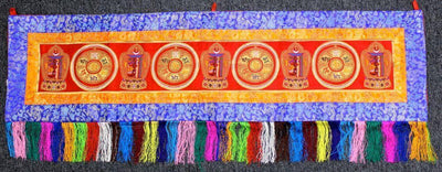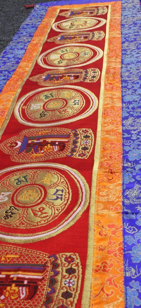 An amazing 4 foot long embroidered wall hanging with kalichakra and Om Mani designs.