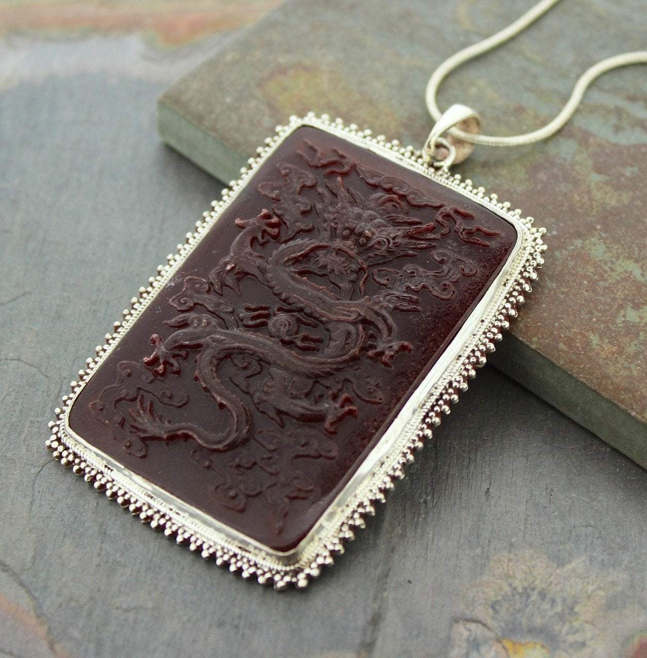This deep red (blood) amber hand carved dragon amulet is set in hand detailed sterling silver in this stunning Tibetan amulet.