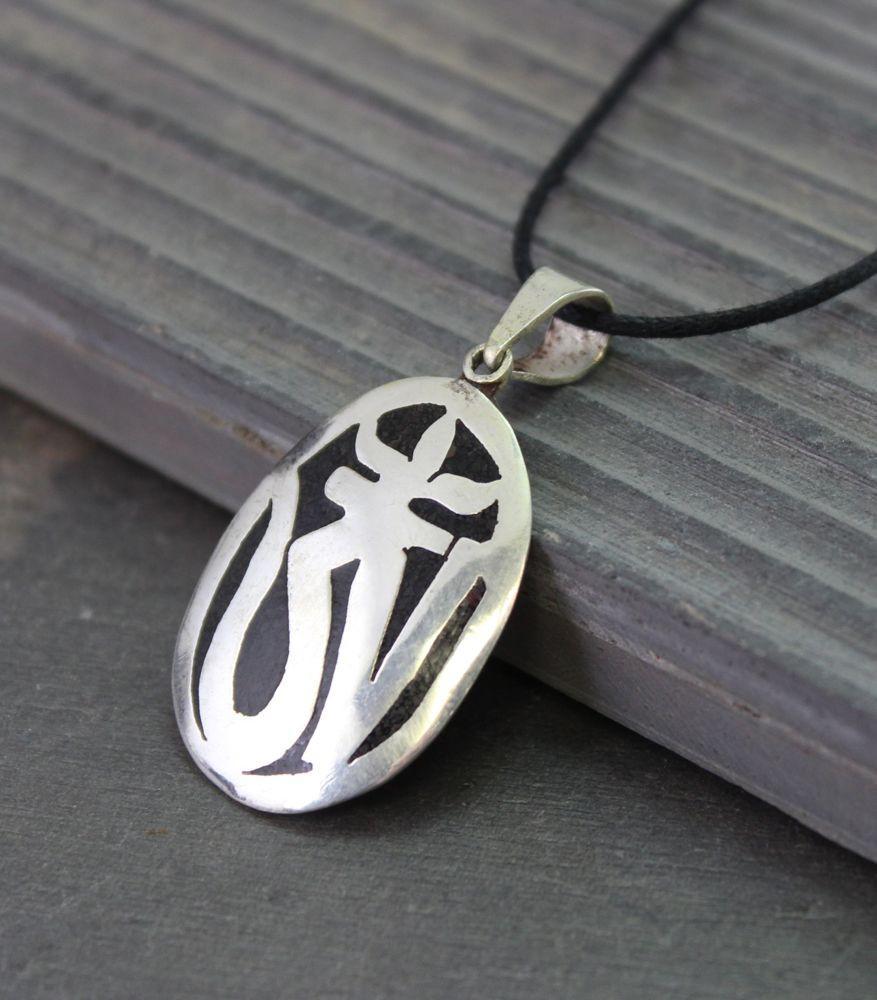 Our very cool Tibetan Om pendant is handmade with inlaid chips of onyx and silverplated.