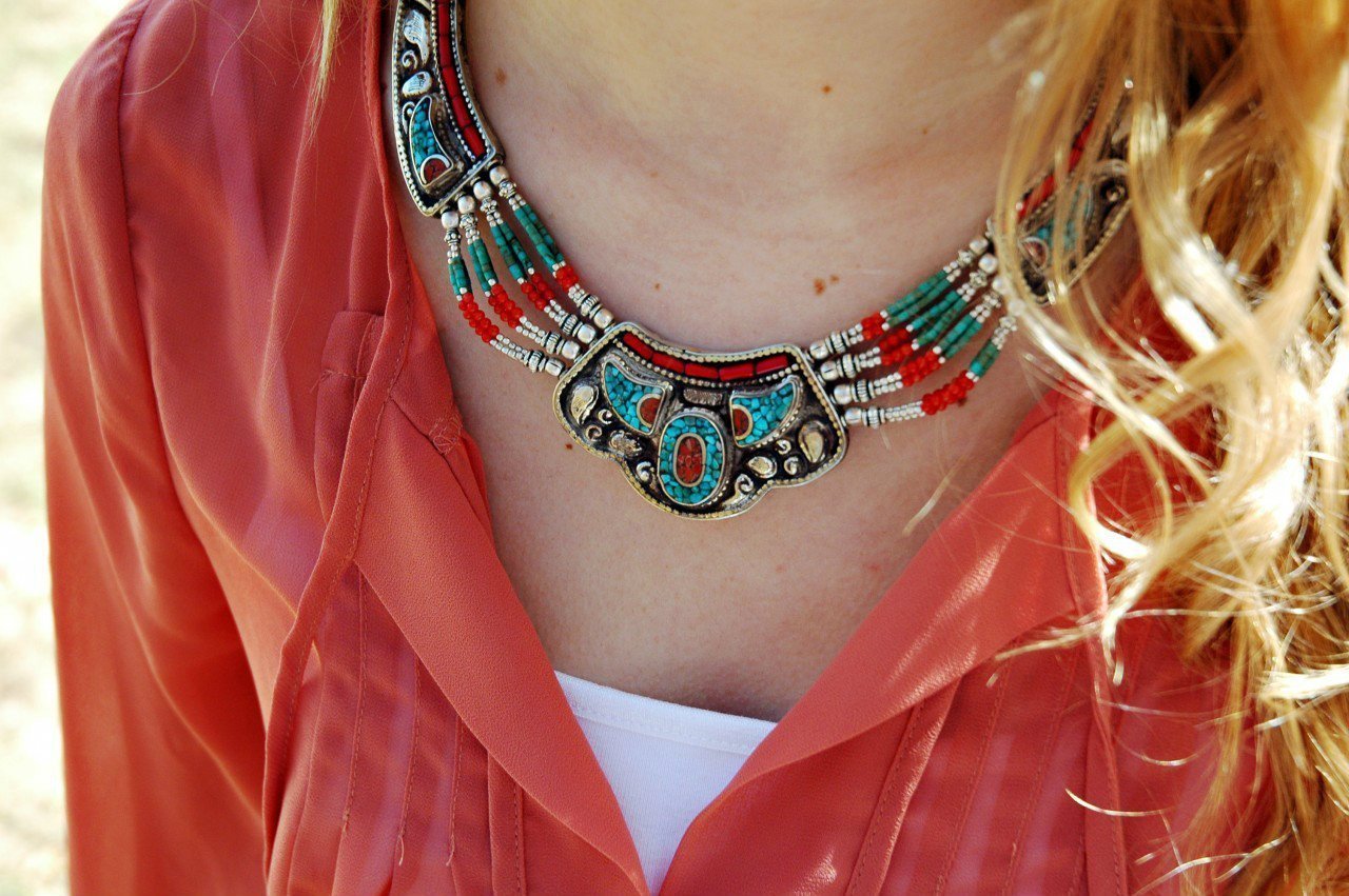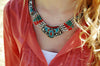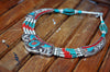 Turquoise stone and coral beaded necklace. 18 inches around.