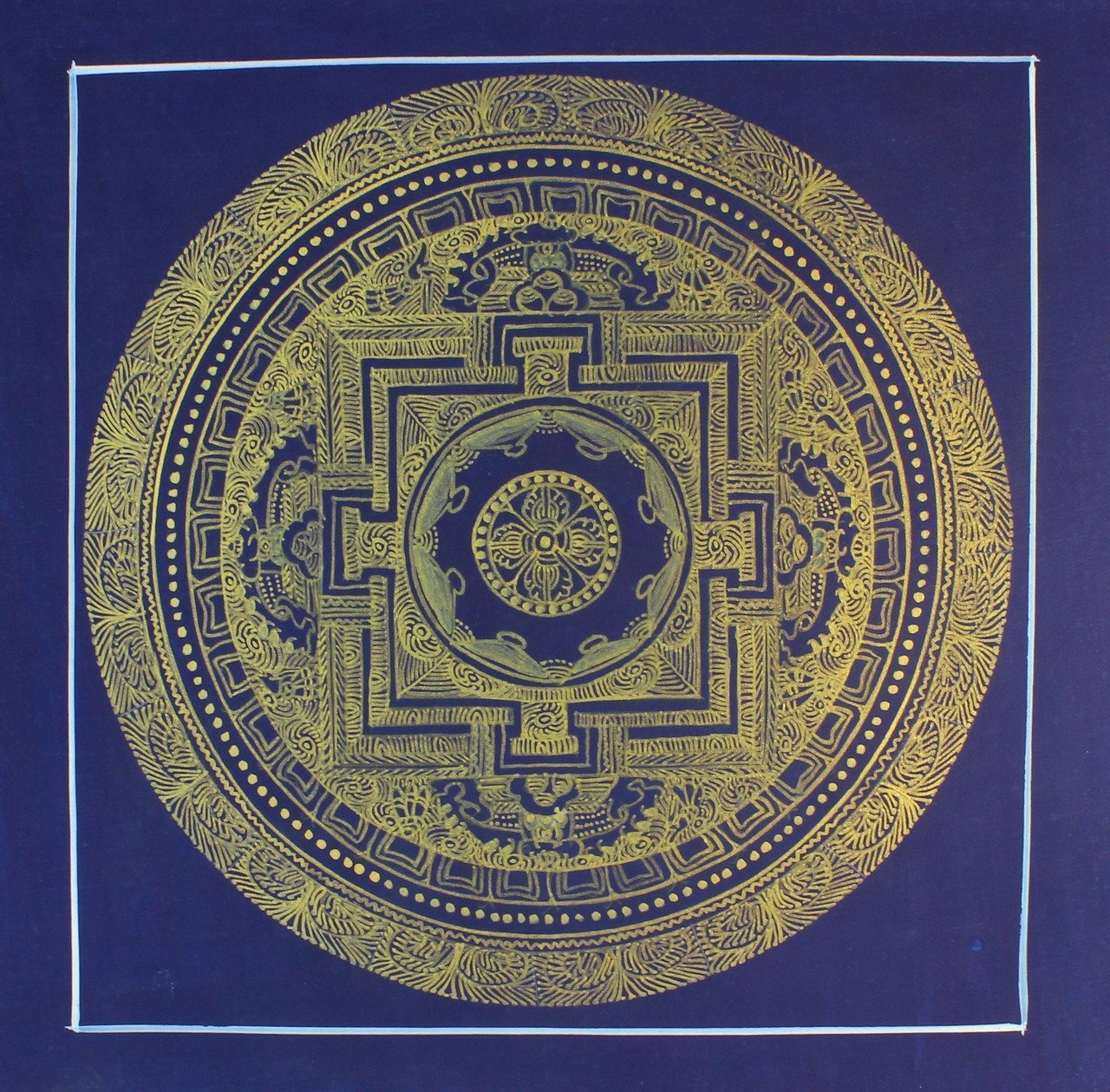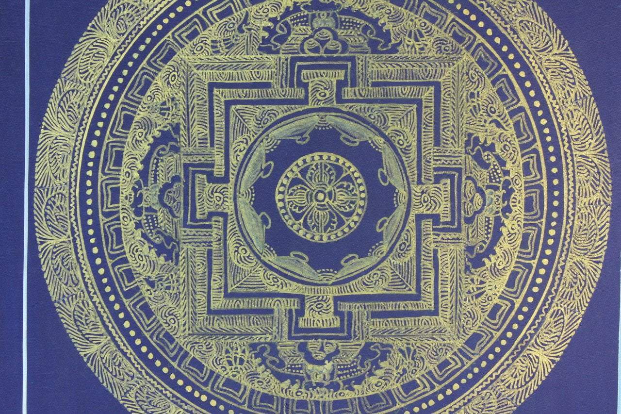 A beautiful hand painted Lapis Blue Medicine Buddha Dorje Mandala thangka on canvas with gold details.