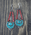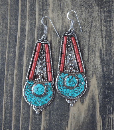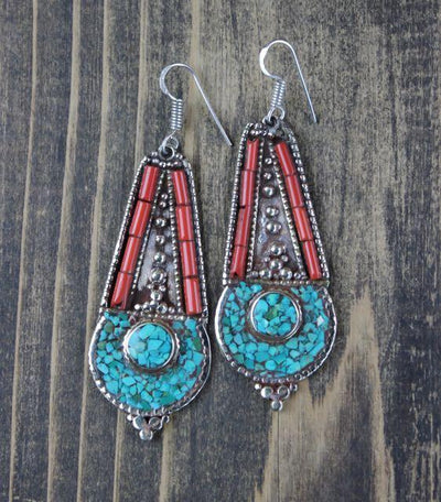 Tibetan women are known to wear very large and bold jewelry and these are in that style.  Colorful, rare stones are prized, and even small pieces are not wasted.  They are seen here in a delicate mosaic inlay of coral and turquoise framing the silver plated brass shield shaped earring.