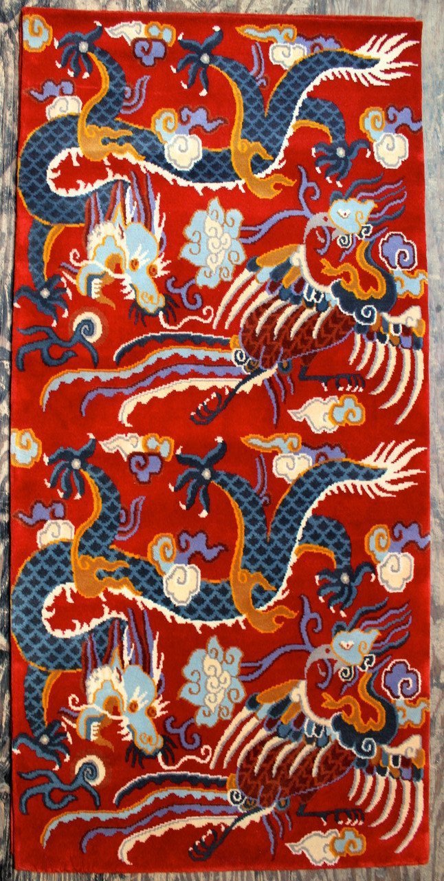 Striking dragon and phoenix carpet. Hand woven in Nepal. 60 knots per square inch.