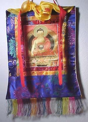 This wonderful Shakyamuni in 3 color Tibetan brocade frame is a wonderfully inexpensive way to bring Tibetan art to your home. Features multi-colored fringe on the bottom of the frame.