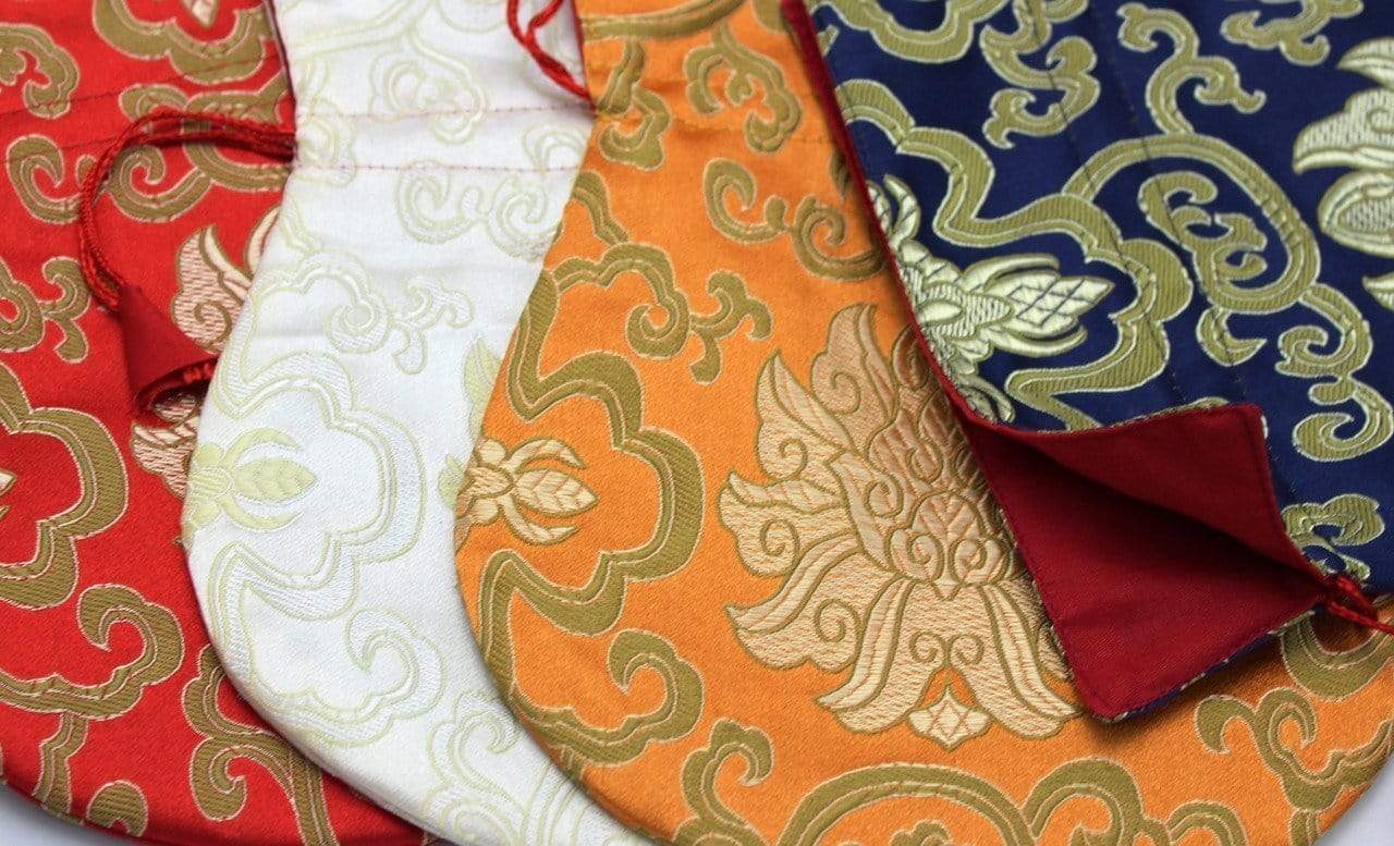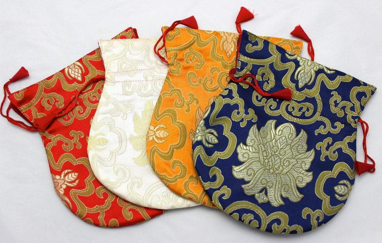 Perfect for traveling with your mala or for use as a unique, elegant clutch. Constructed of medium-weight, embroidered silk with a durable red cotton liner. Includes red drawstring closure.