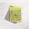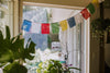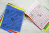 Set includes 5 strands of flags with 10 flags per strand. Each flag measures approximately 4 by 5 inches; one full strand is about 4 feet long. Made of polyester in Nepal.
