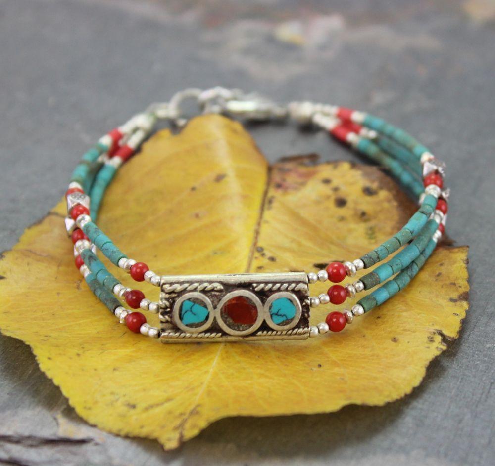 This detailed and simple bracelet uses true turquoise and coral beads with hill tribe silver spacers.