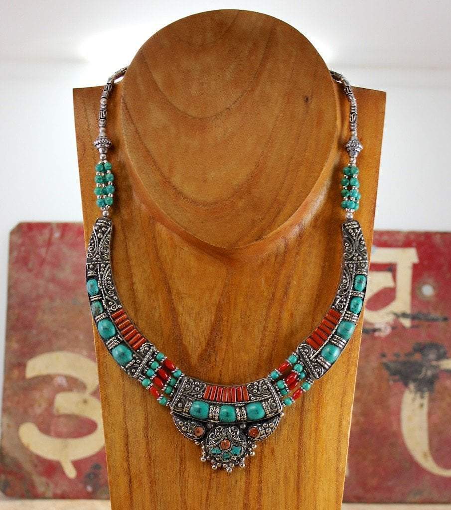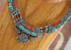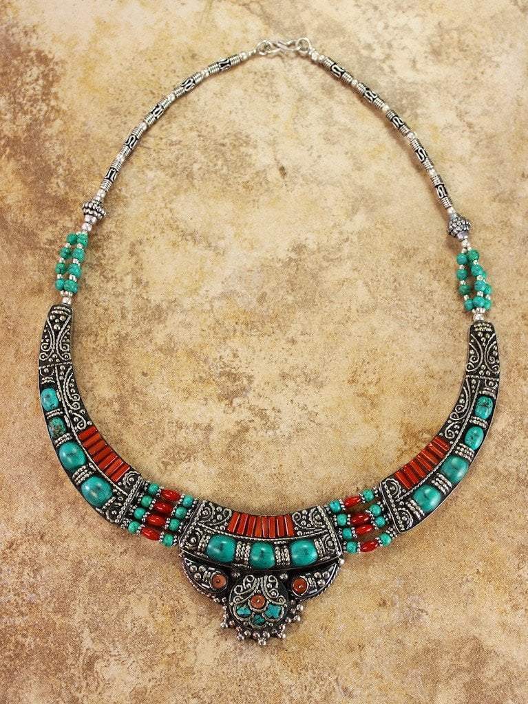 named after the region in Tibet where HH the Dalai lama was born, our Amdo necklace was hand made in Kathmandu Nepal by Tibetan jewelry artist Karma Dolma. Strings of turquoise and coral beads connect traditional Tibetan inlaid metal focal beads.