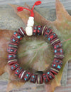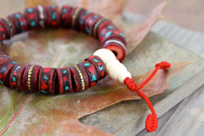 These inlaid bone malas are one of our best sellers and we had our mala makers make these stretchy wrist malas with these red water buffalo bone beads. Inlaid with turquoise and coral.