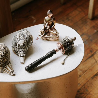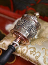 • A sacred symbol of Tibetan Buddhist practice, this traditional handheld prayer wheel honors centuries of spiritual heritage.