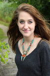 A totally unique necklace handmade in Kathmandu, Nepal. The main focal piece incorporates coral and turquoise in a temple design, linked by four strands of turquoise, coral, and copal beads with silver spacers.