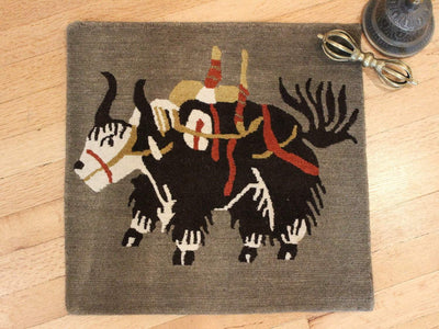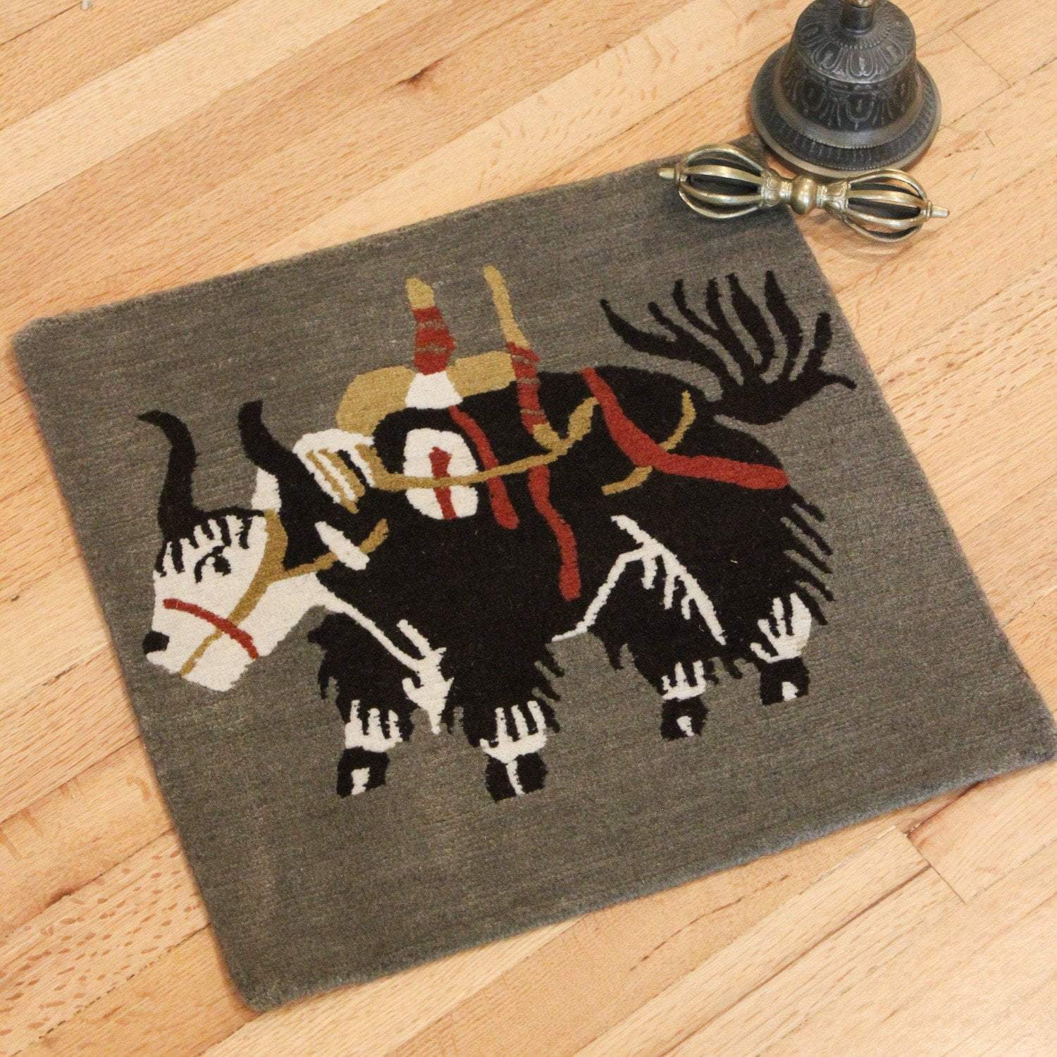 A classic DharmaShop favorite! This 100% Himalayan wool rug is great for a meditation or altar space. The brownish-green rug includes a black, white, red colored yak design. Each rug is made entirely by hand using a traditional crafting process, featuring 100 knots per square inch.