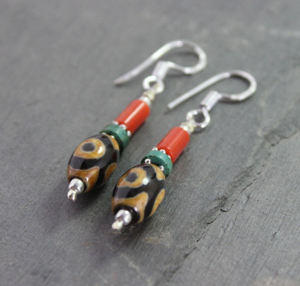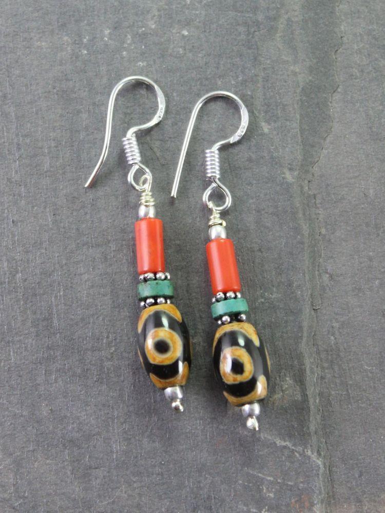 A beautiful set of small agate Tibetan dzi beads hangs with traditional turquoise and coral beads. Tibetans believe that a special dzi bead chooses its wearer and then offers protection from harm.